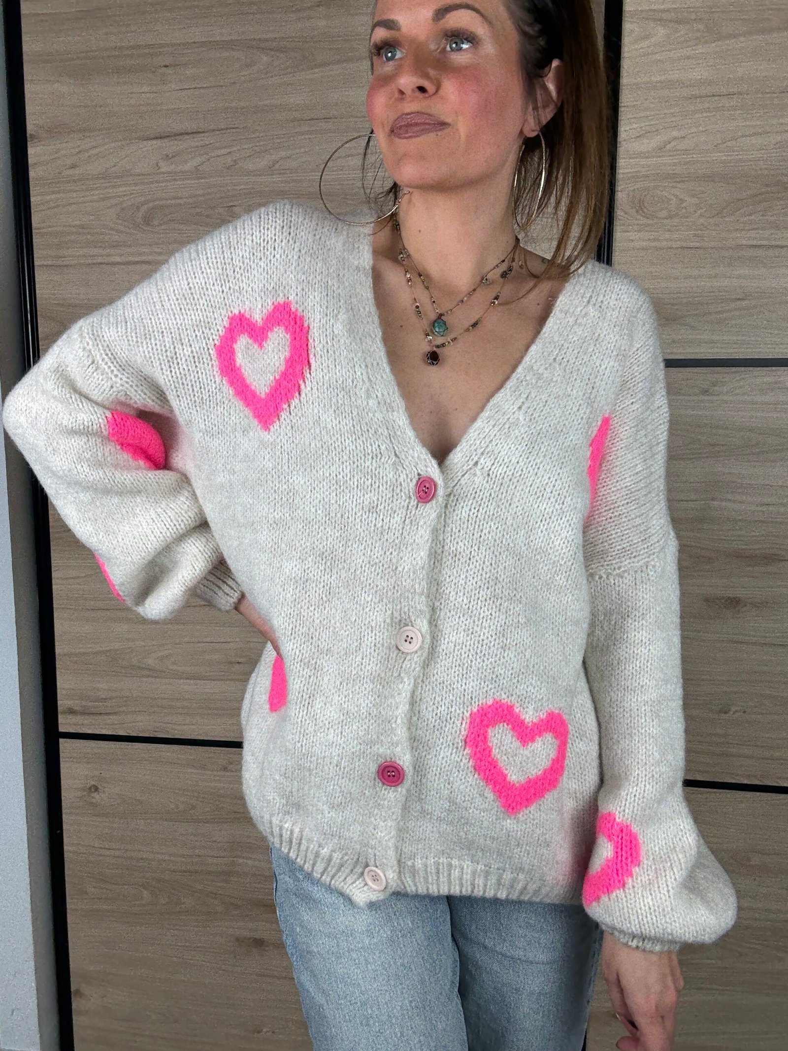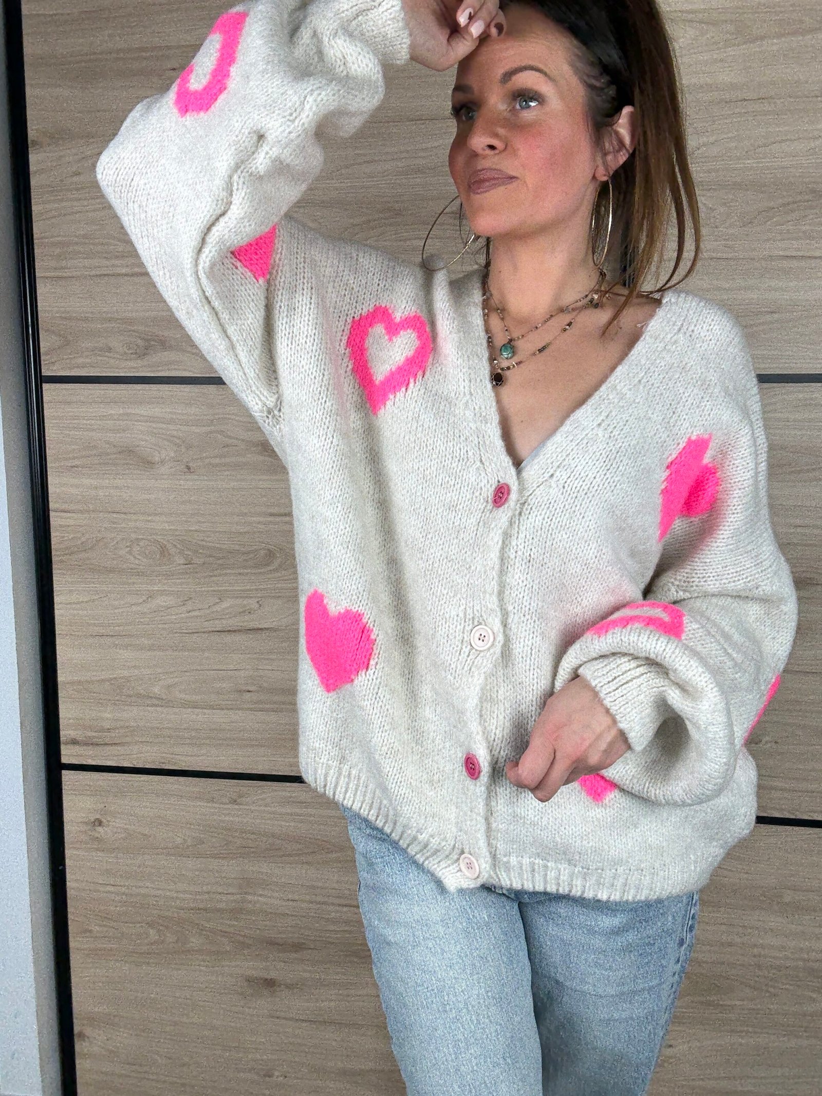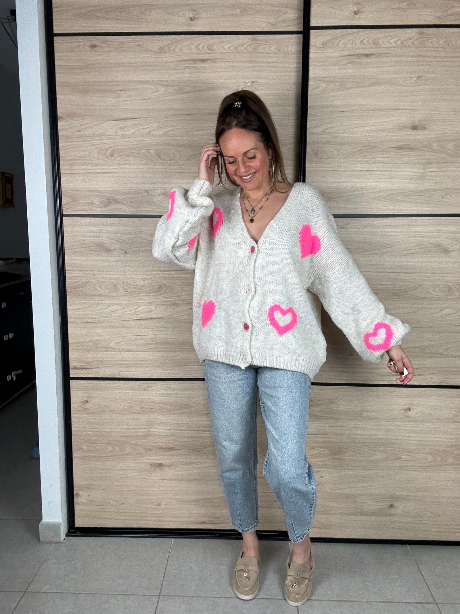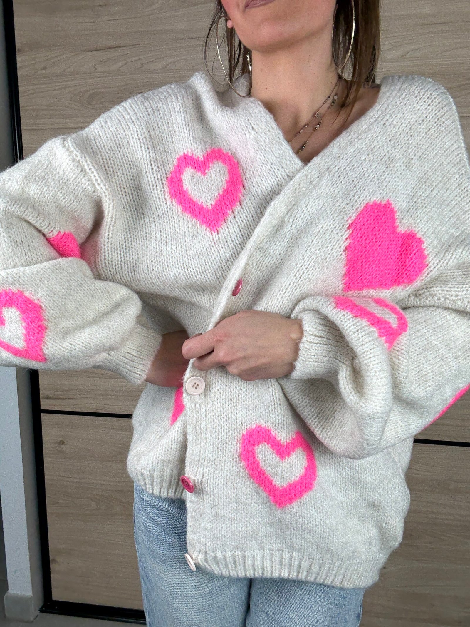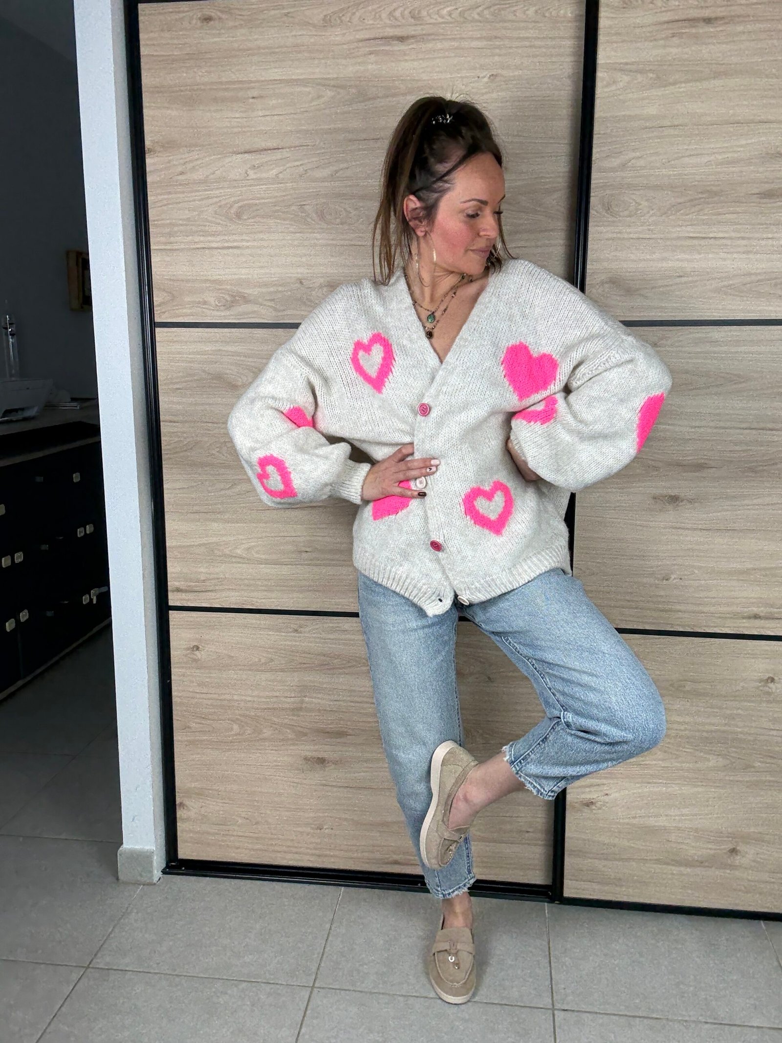 🤍Ajoutez une touche de douceur et de romantisme à votre dressing avec ce cardigan en laine couleur écru, décoré de cœurs roses délicats pour un look à la fois original et charmant.