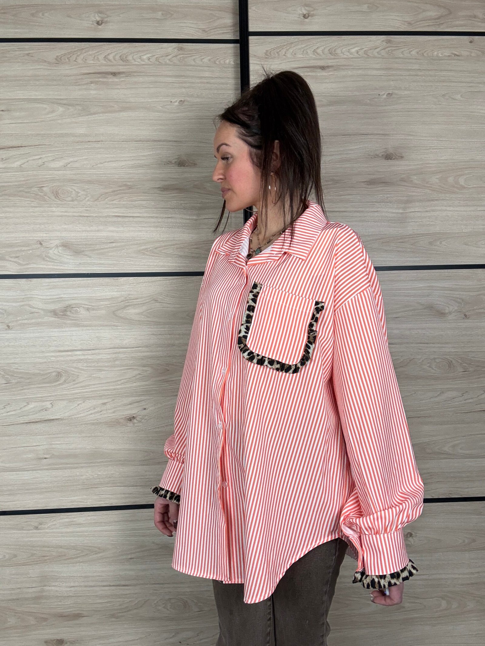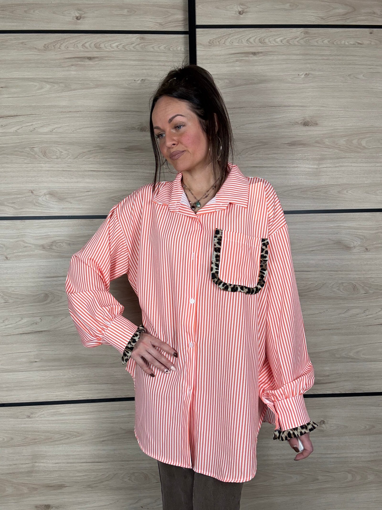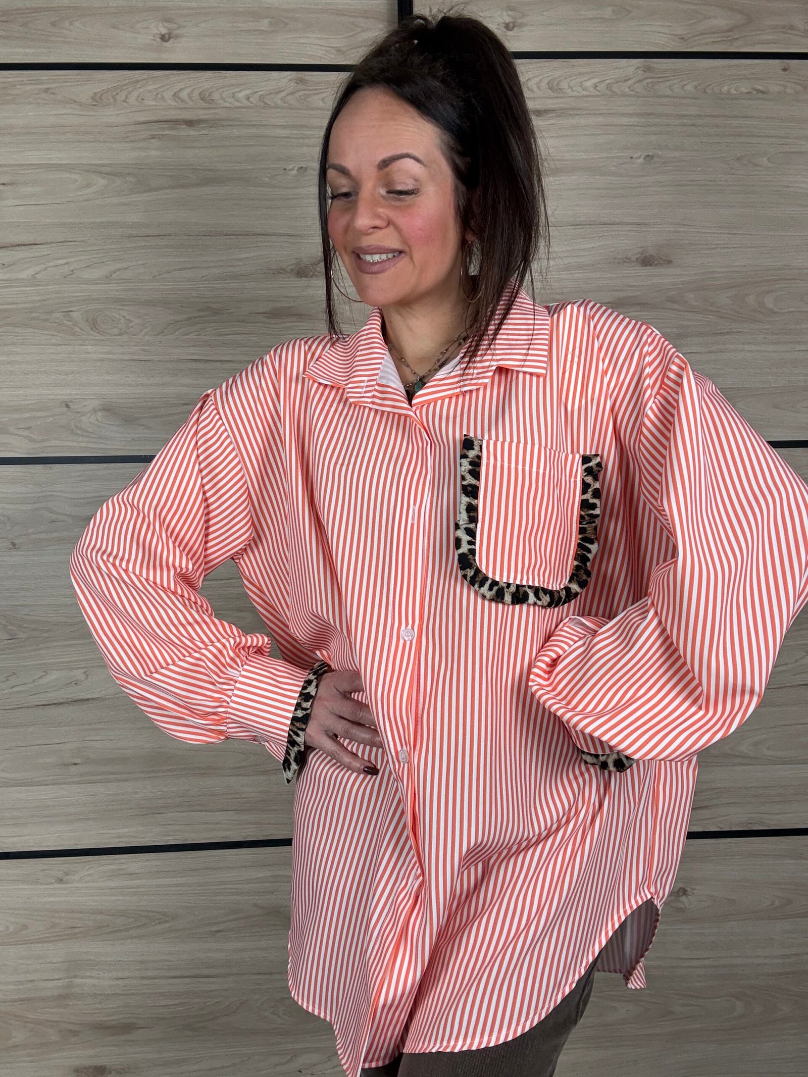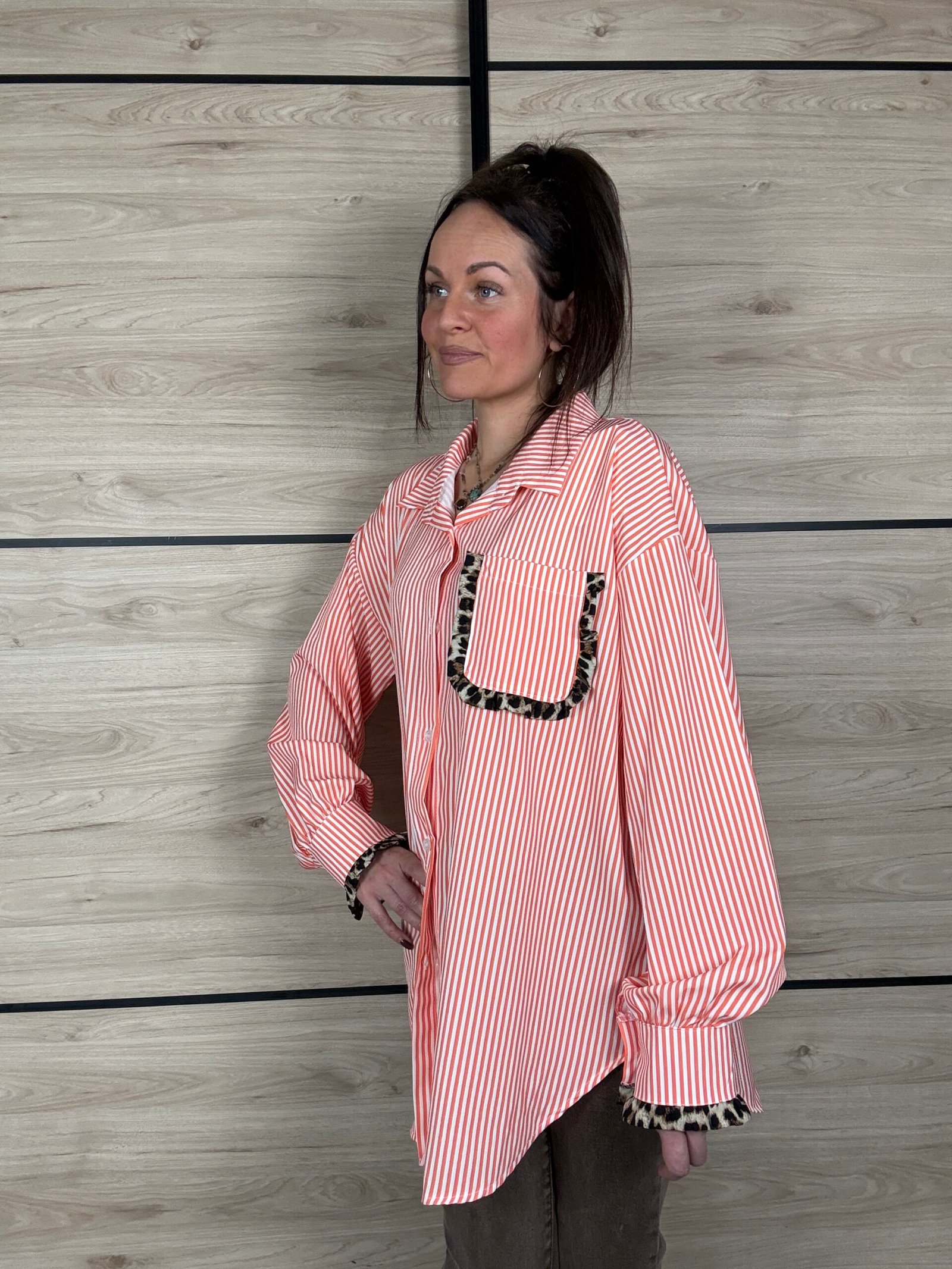 Avec ses rayures blanches et orange, elle apporte une touche lumineuse et dynamique à tes looks. Son petit twist mode ? De subtils détails léopard délicatement placés sur les manches et la poitrine, juste ce qu’il faut pour réveiller la silhouette avec élégance 🐆