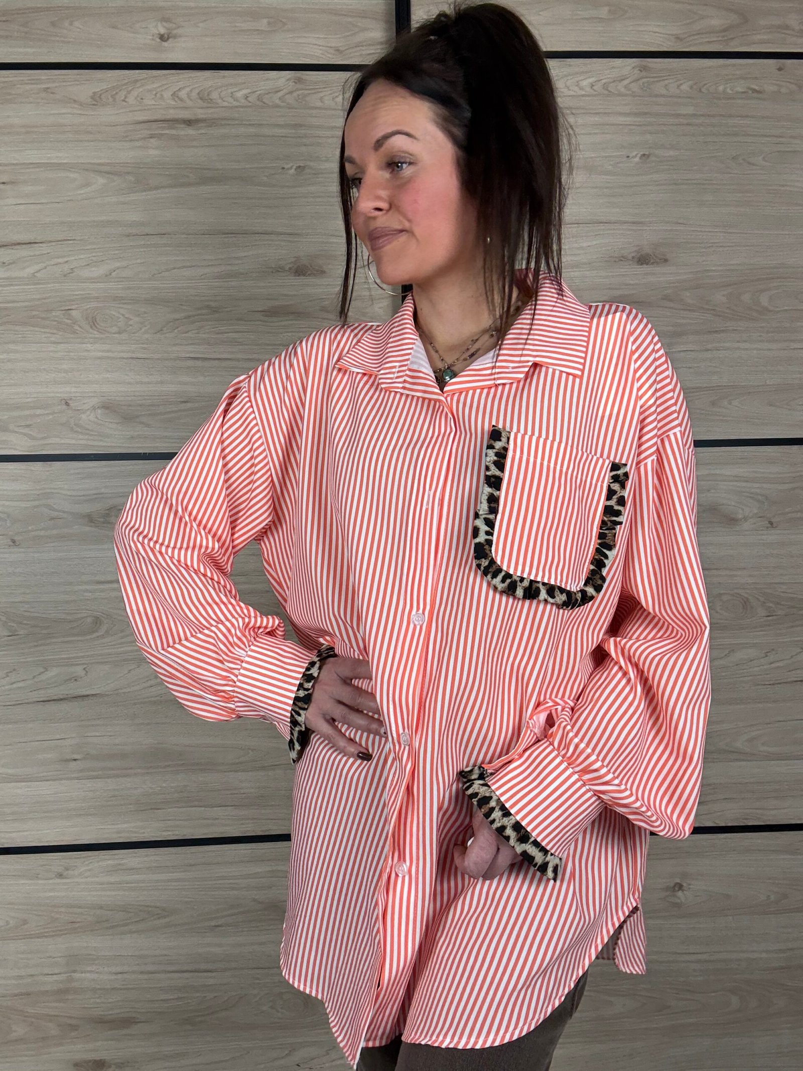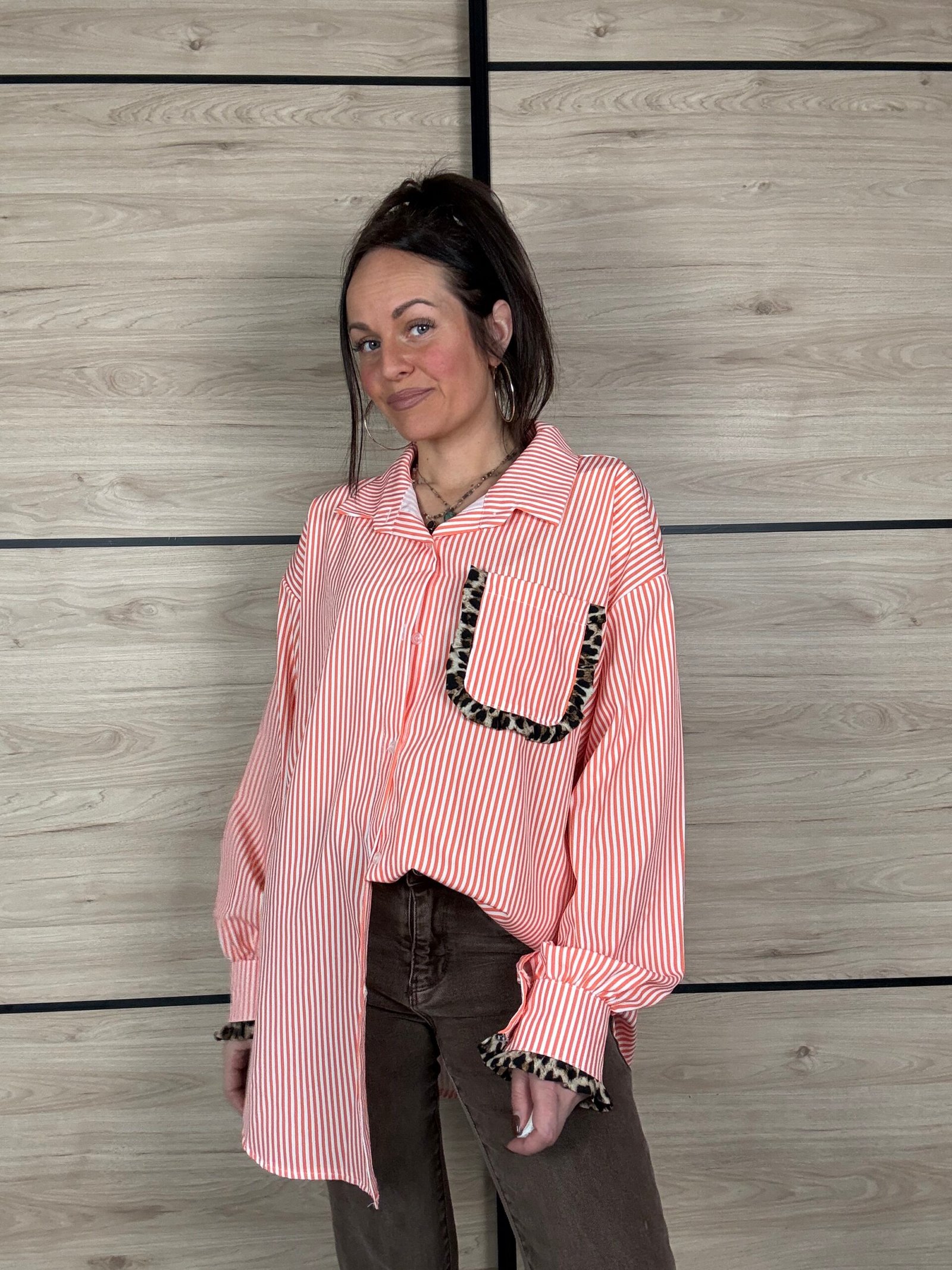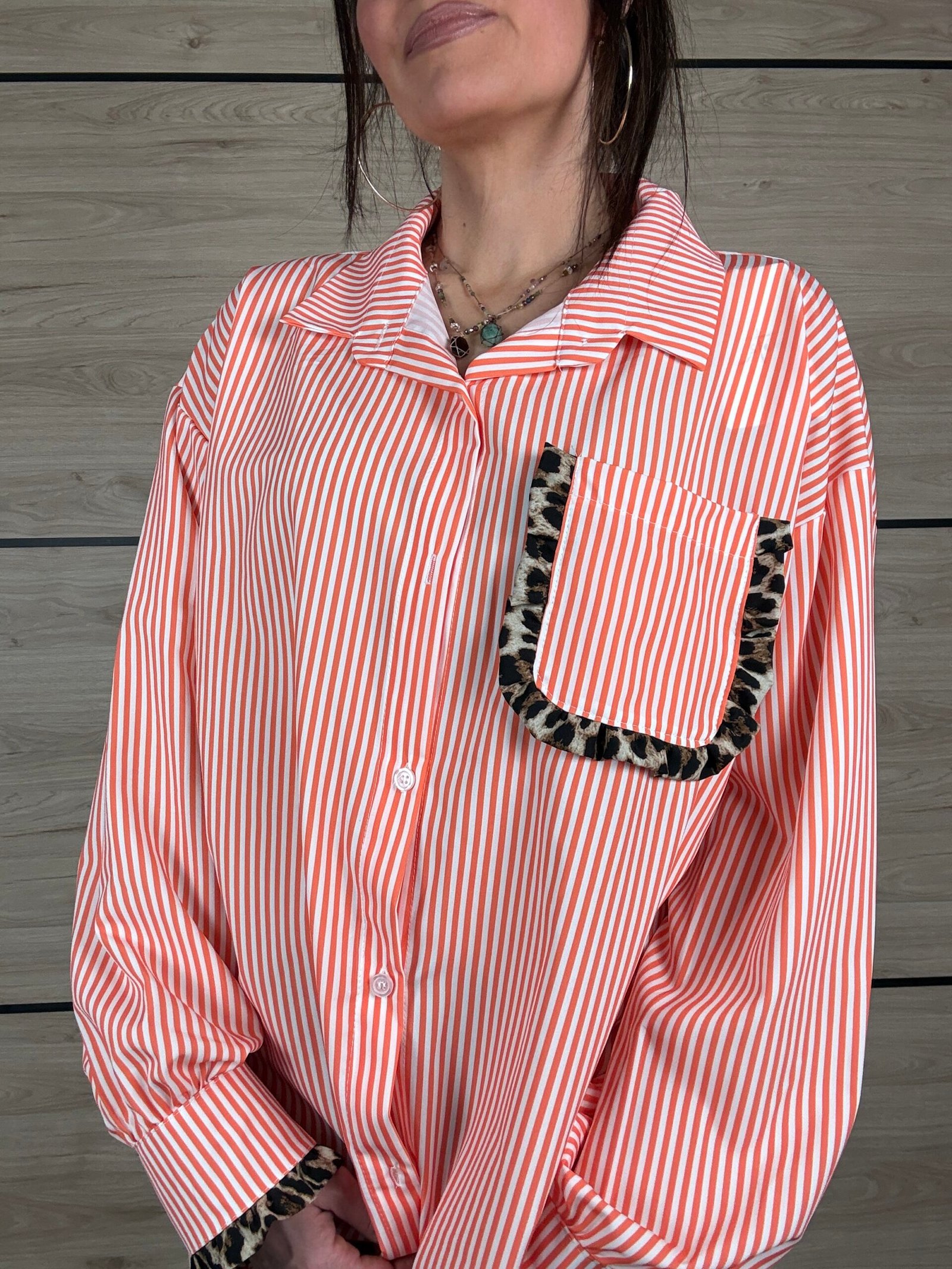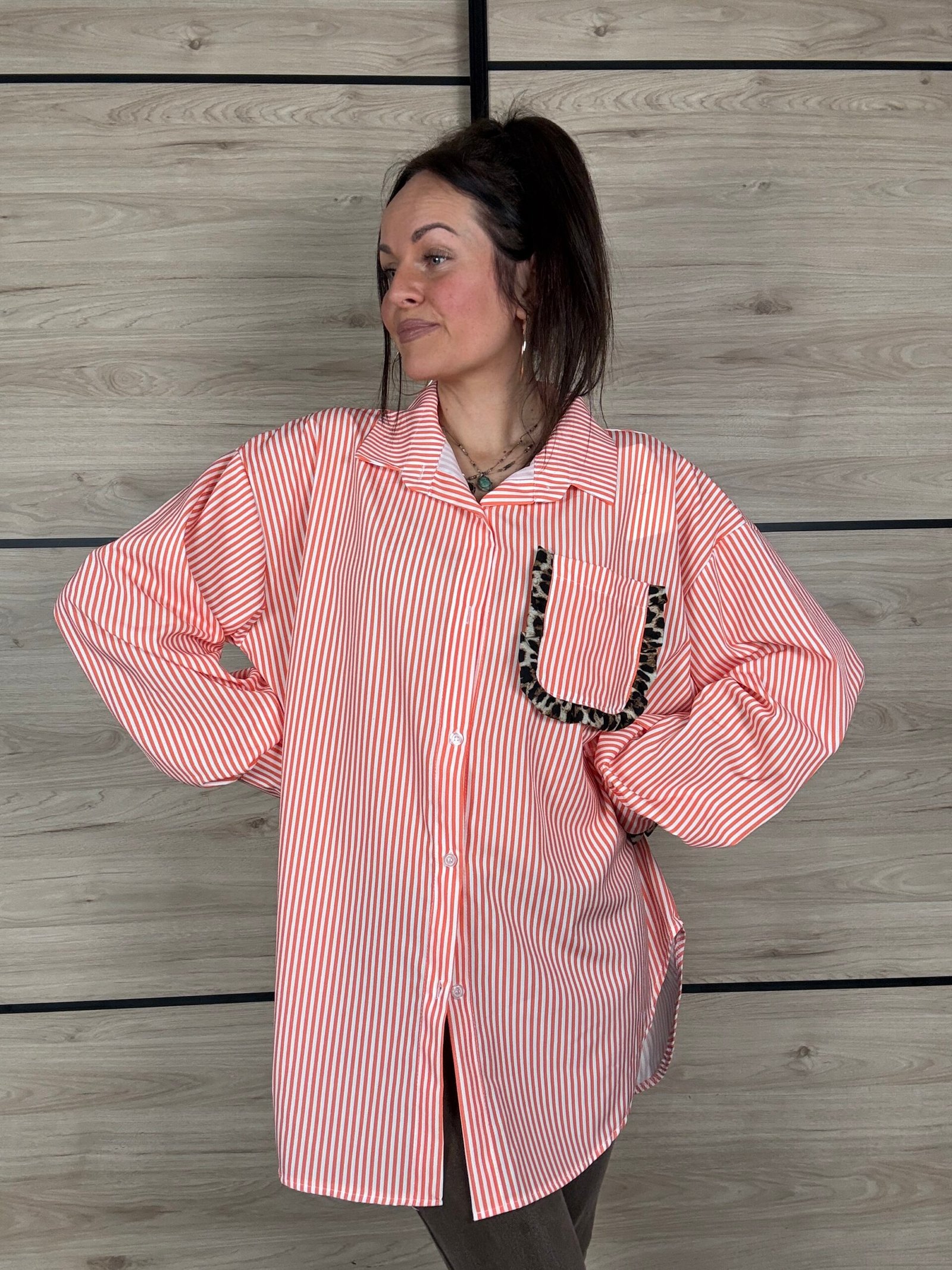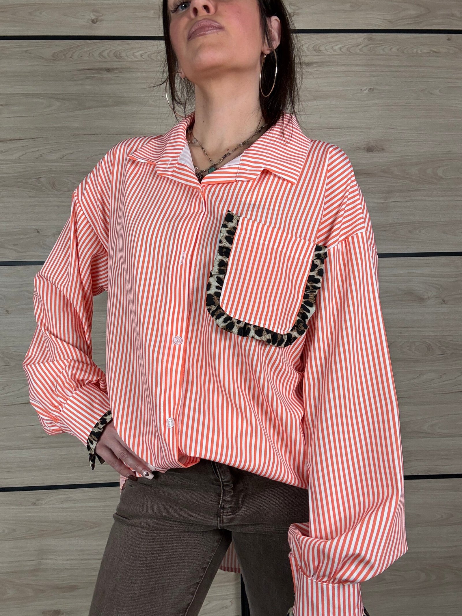 Avec ses rayures blanches et orange, elle apporte une touche lumineuse et dynamique à tes looks. Son petit twist mode ? De subtils détails léopard délicatement placés sur les manches et la poitrine, juste ce qu’il faut pour réveiller la silhouette avec élégance 🐆