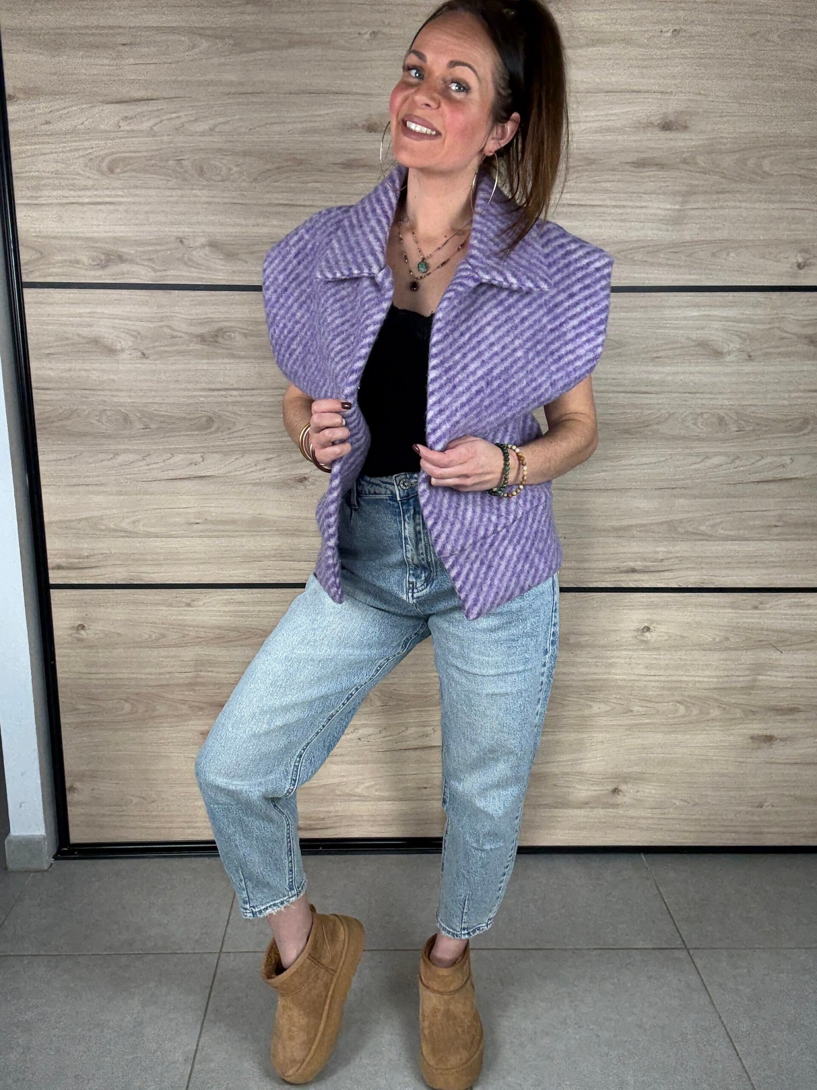 Impossible de passer inaperçue avec ce gilet sans manches en laine bouillie, une piĂšce aussi chic quâaudacieuse. Sa base violette Ă©lĂ©gante est dynamisĂ©e par de rayures, qui apportent instantanĂ©ment du pep’s et du caractĂšre et rĂ©veillent nâimporte quelle tenue.