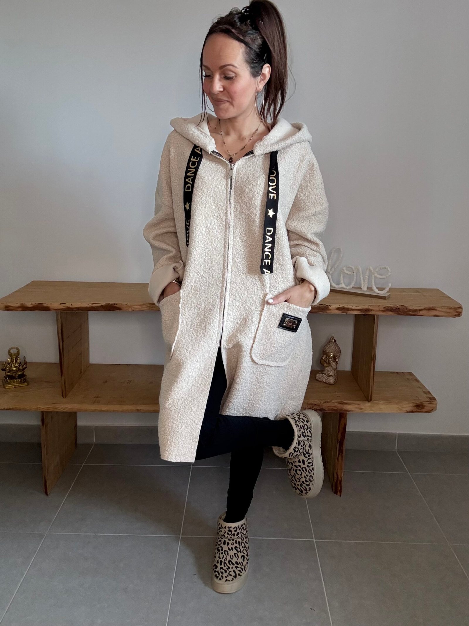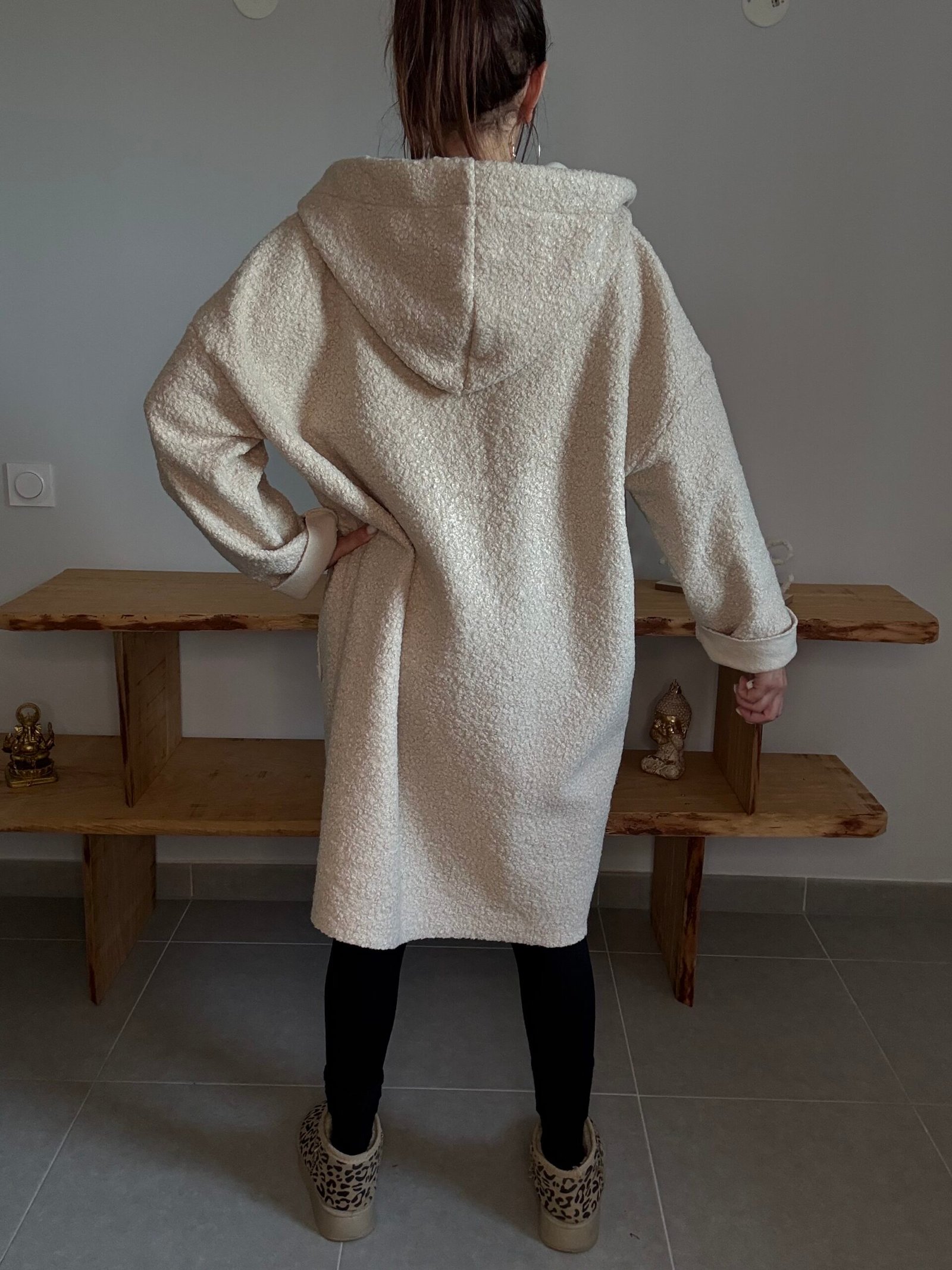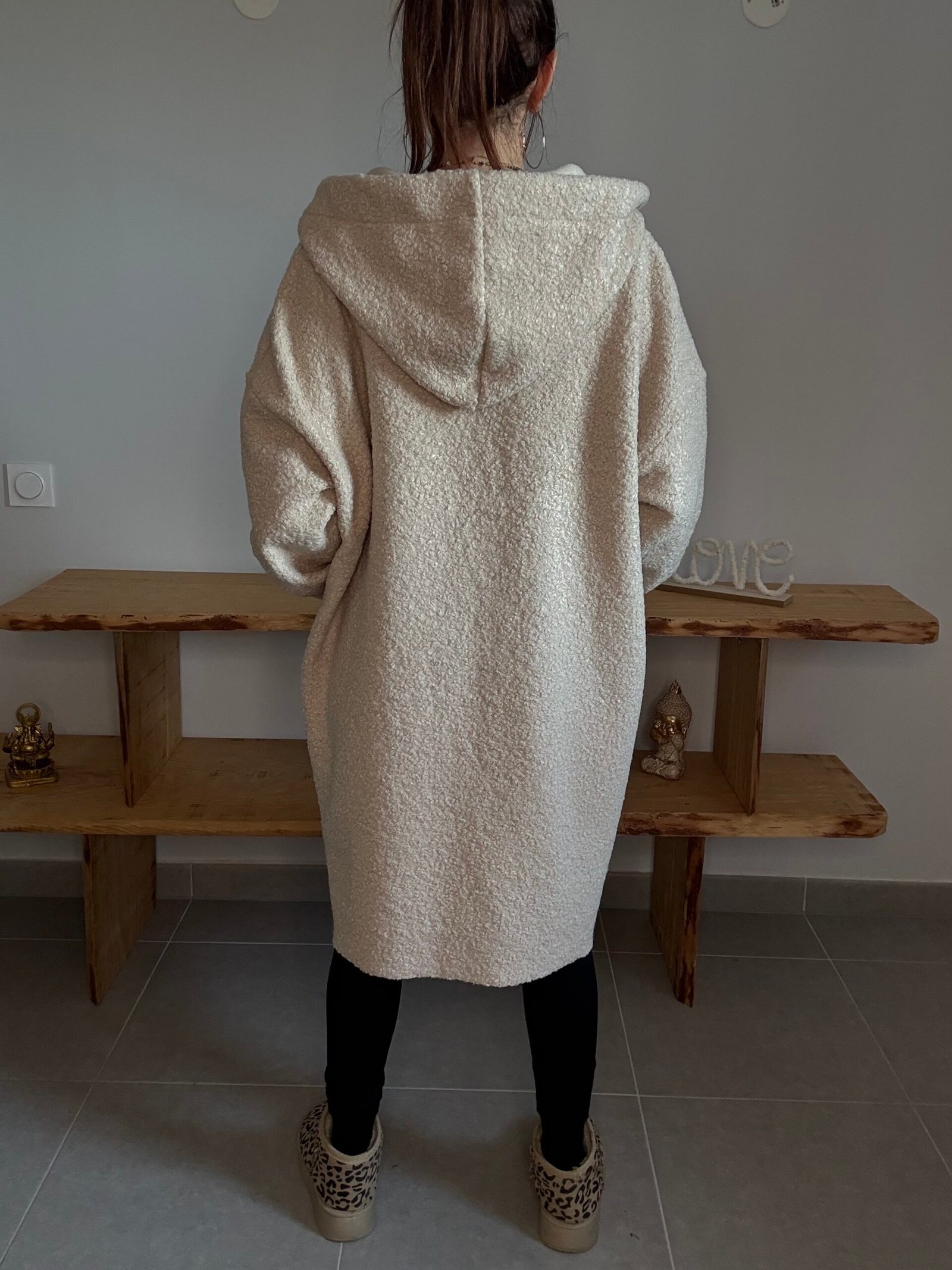 💖 On adore : sa matière bouclette douce, sa capuche pratique, ses détails dorés élégants et son confort incomparable.
