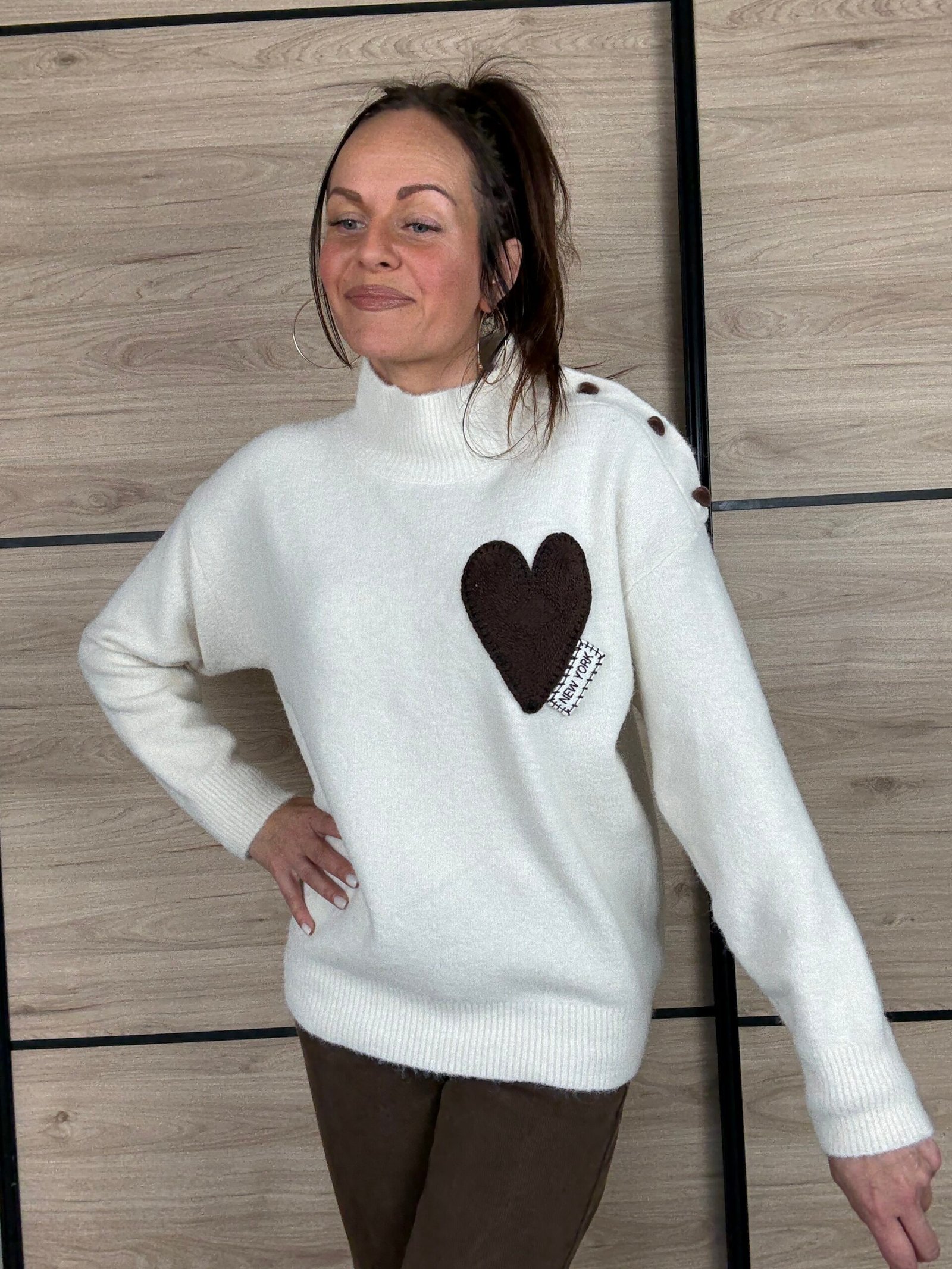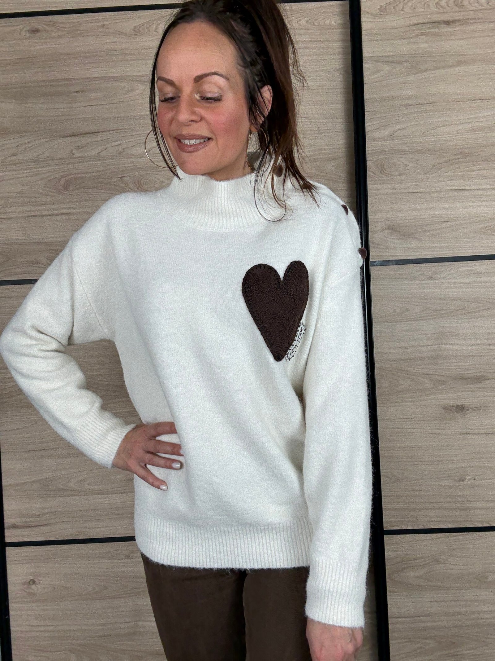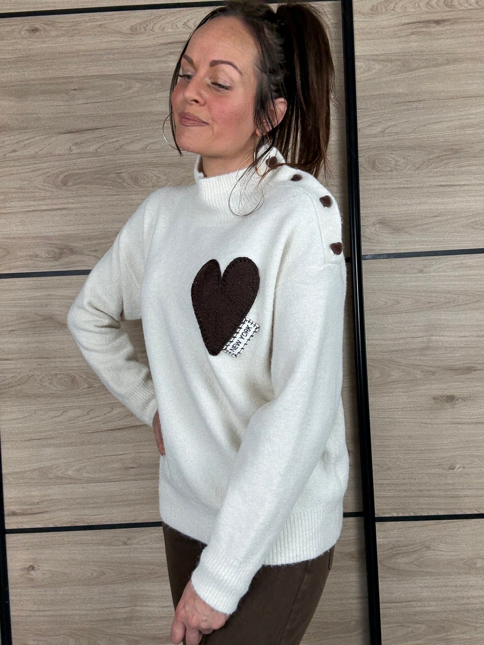Et le détail qui change tout ? Sur l’une des épaulettes, du col jusqu’à l’épaule, une ligne de boutons cœur marron chocolat. Un détail adorable et original qui fait tout le charme du pull… et qui ne passe pas inaperçu !