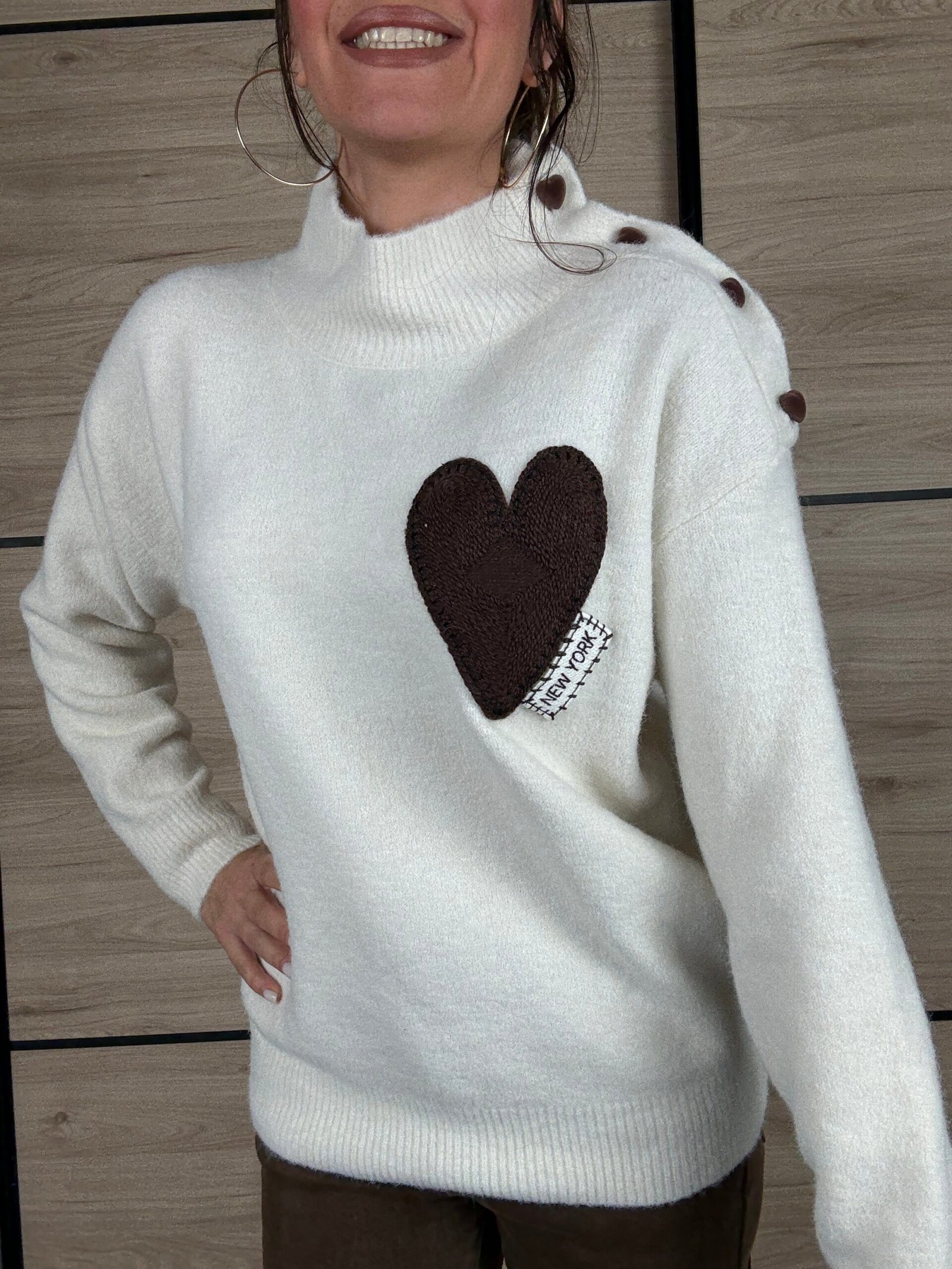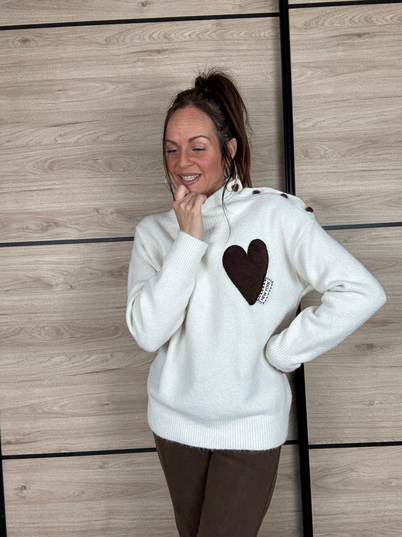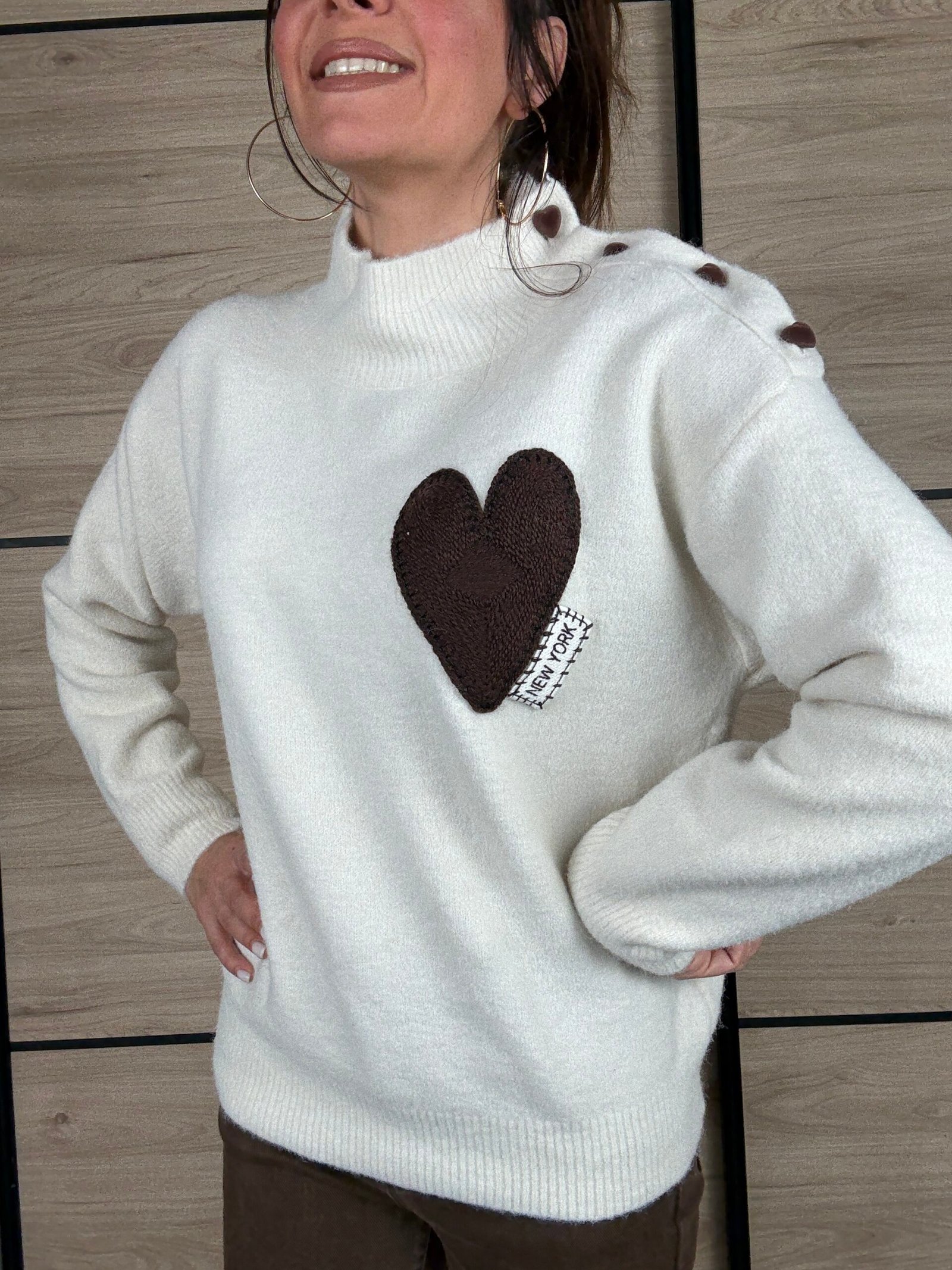 Et le détail qui change tout ? Sur l’une des épaulettes, du col jusqu’à l’épaule, une ligne de boutons cœur marron chocolat. Un détail adorable et original qui fait tout le charme du pull… et qui ne passe pas inaperçu !