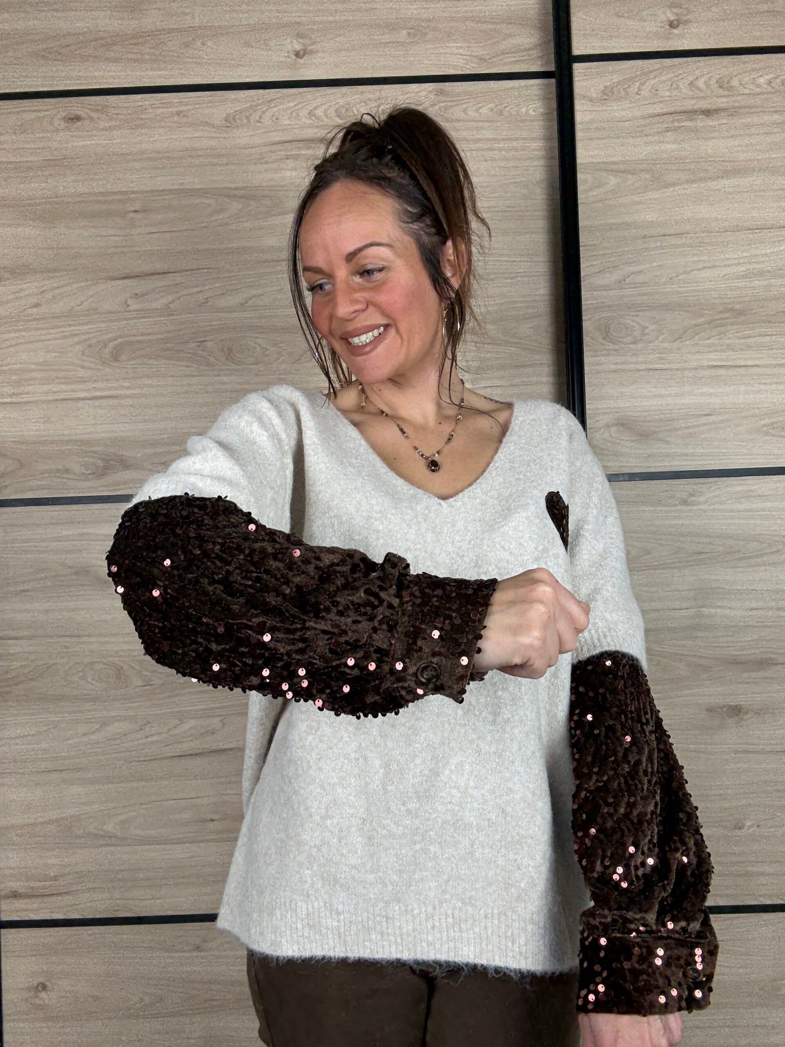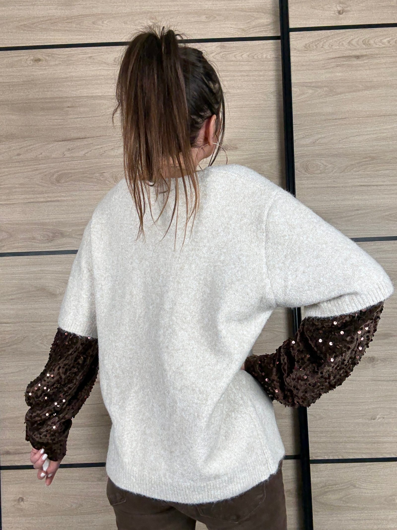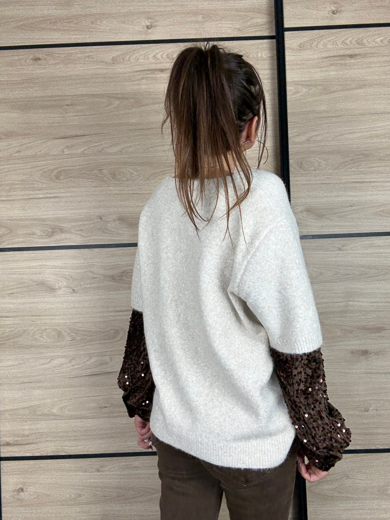 Dans une jolie teinte beige chaleureuse, il est sublimé par de magnifiques manches couleur chocolat en sequins paillettés, du coude jusqu’au poignet. Un contraste lumineux qui attire tout de suite l’œil sans en faire trop.