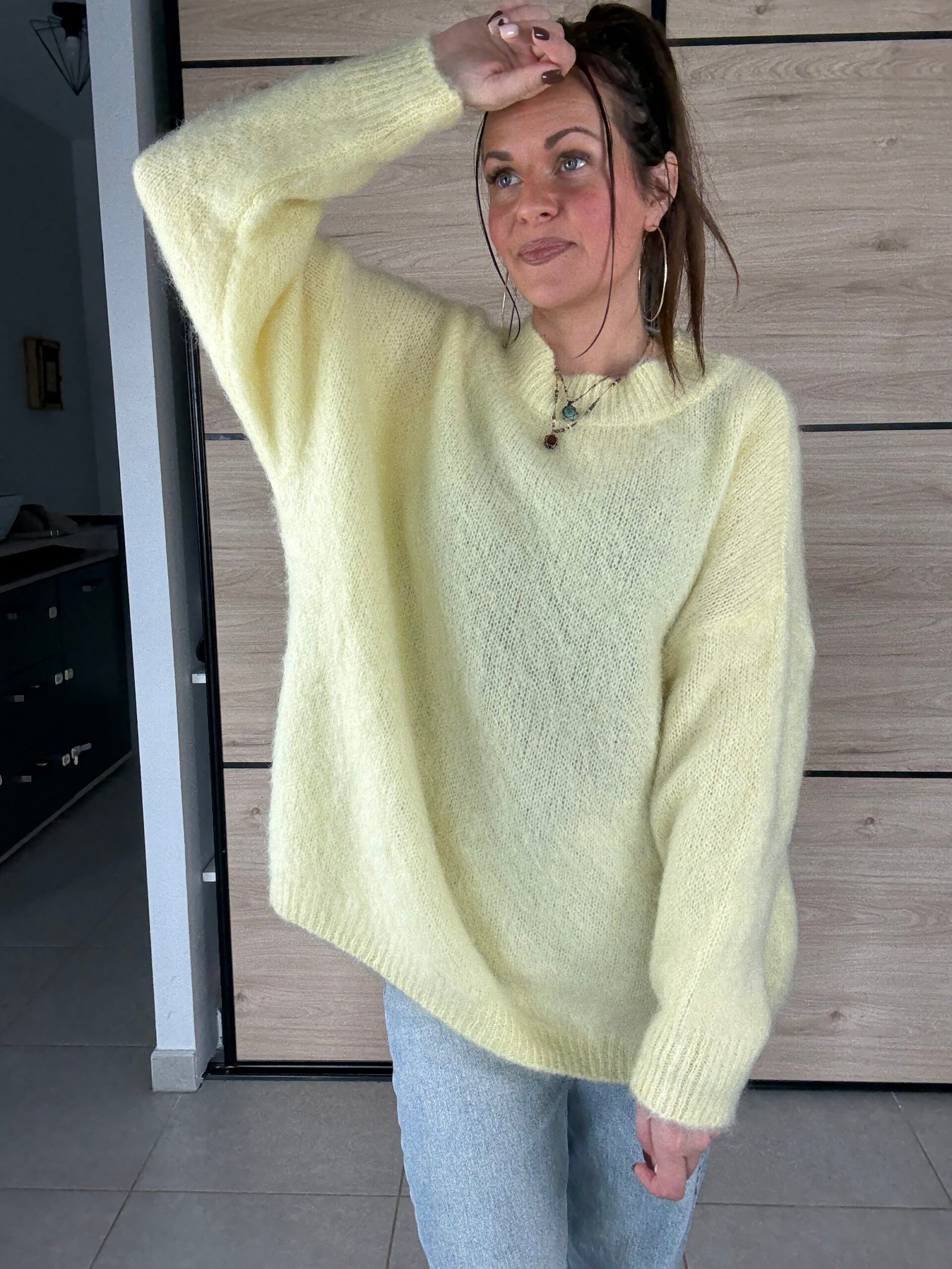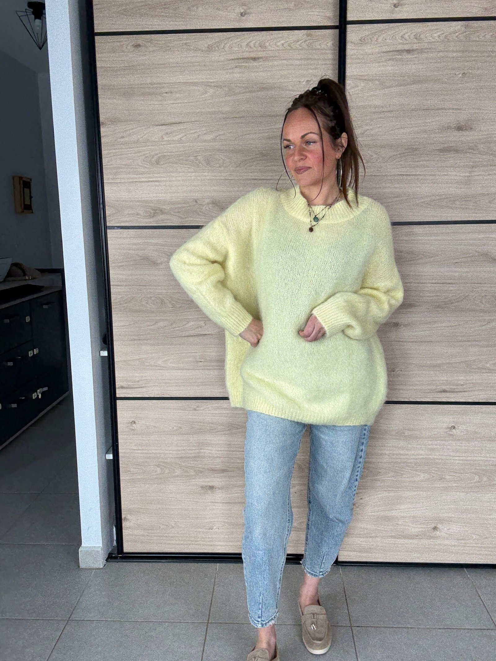 Sa coupe oversize parfaitement maîtrisée lui donne une allure moderne et élégante. Il tombe très bien et sublime la silhouette sans jamais l’alourdir. C’est le genre de pull dans lequel on se sent immédiatement bien, chic sans effort.