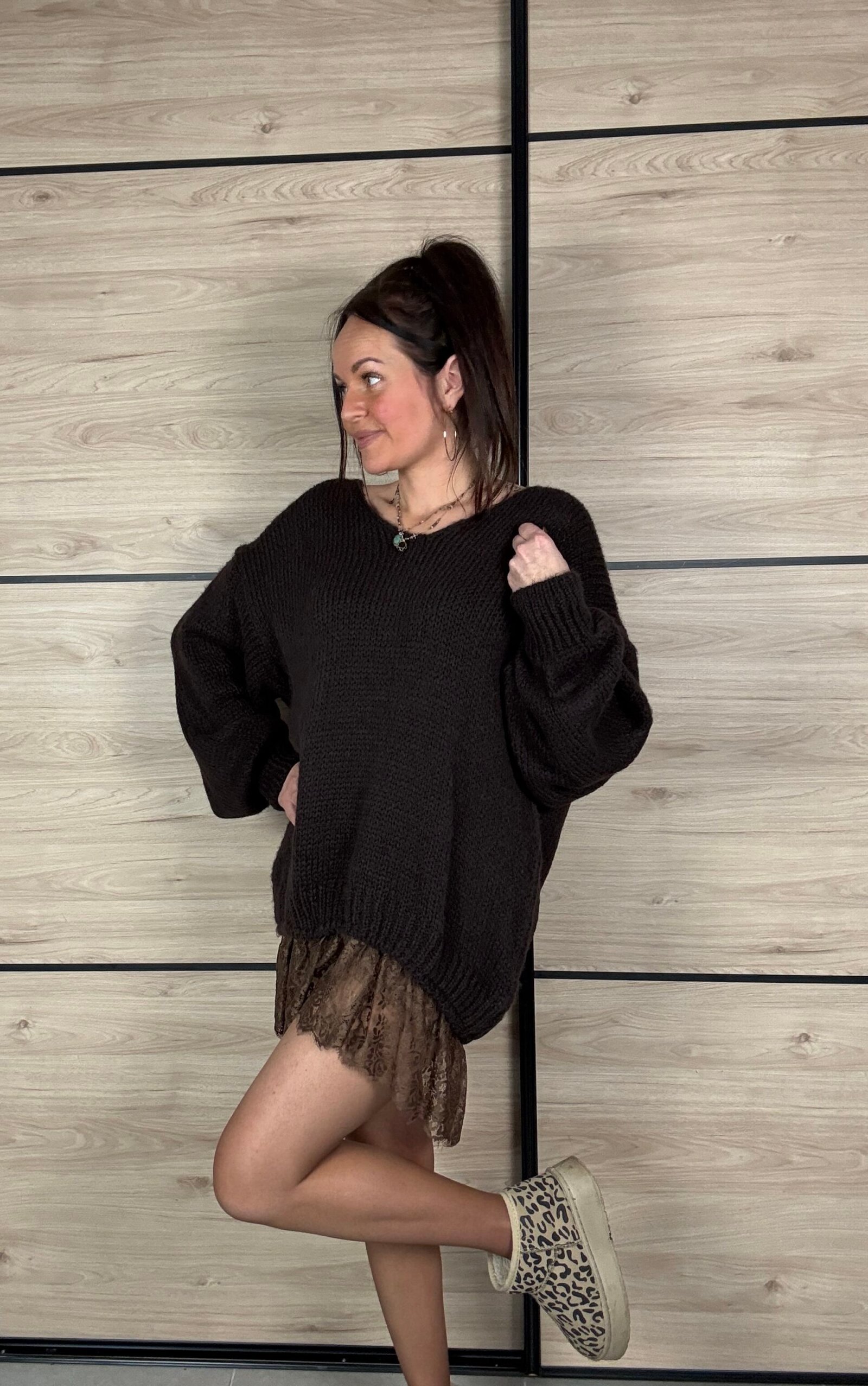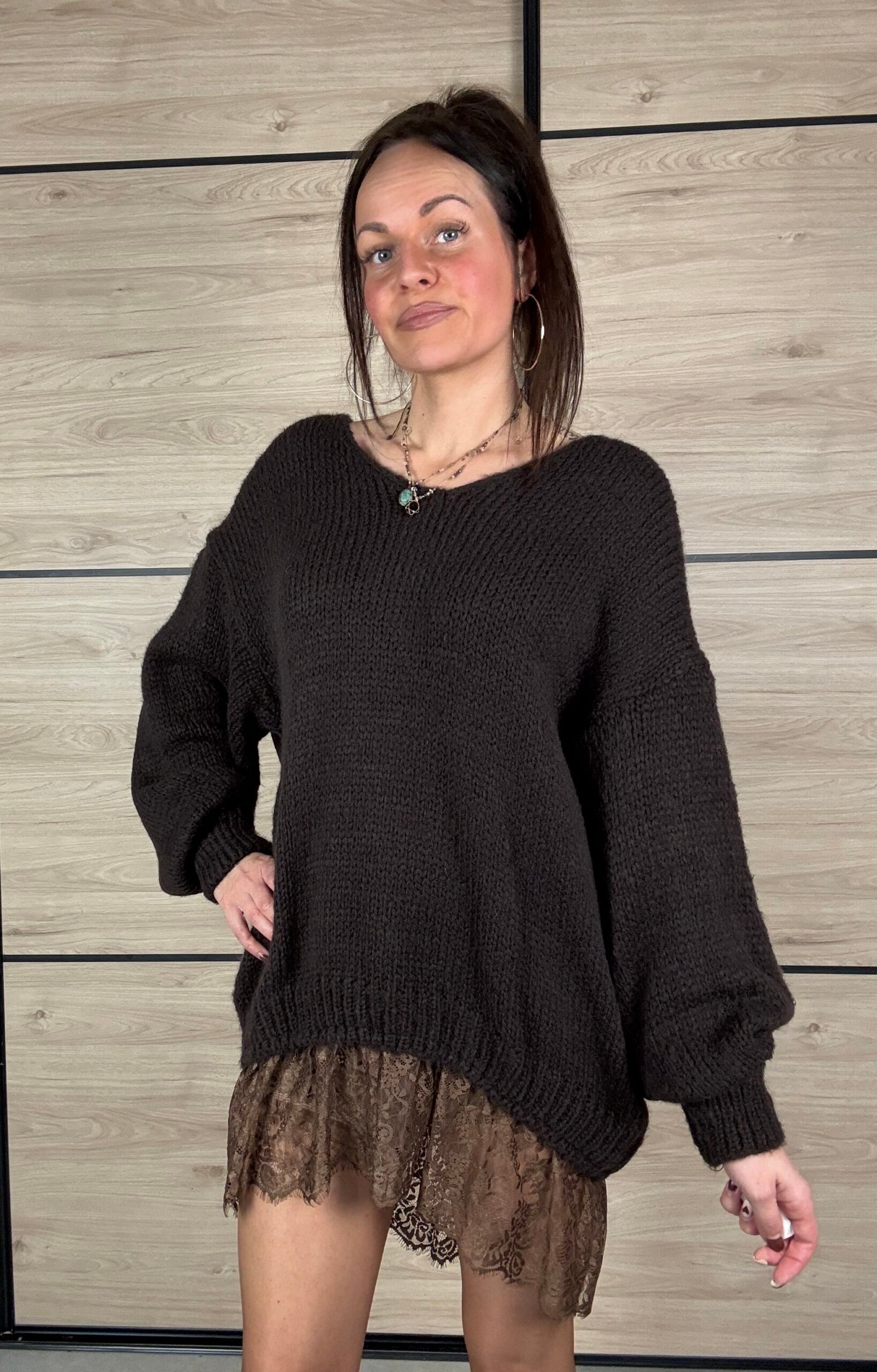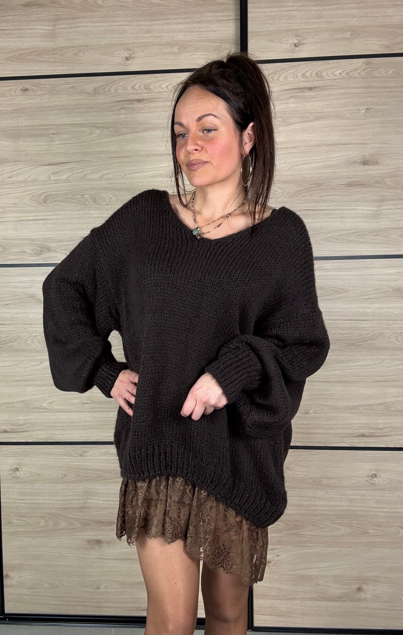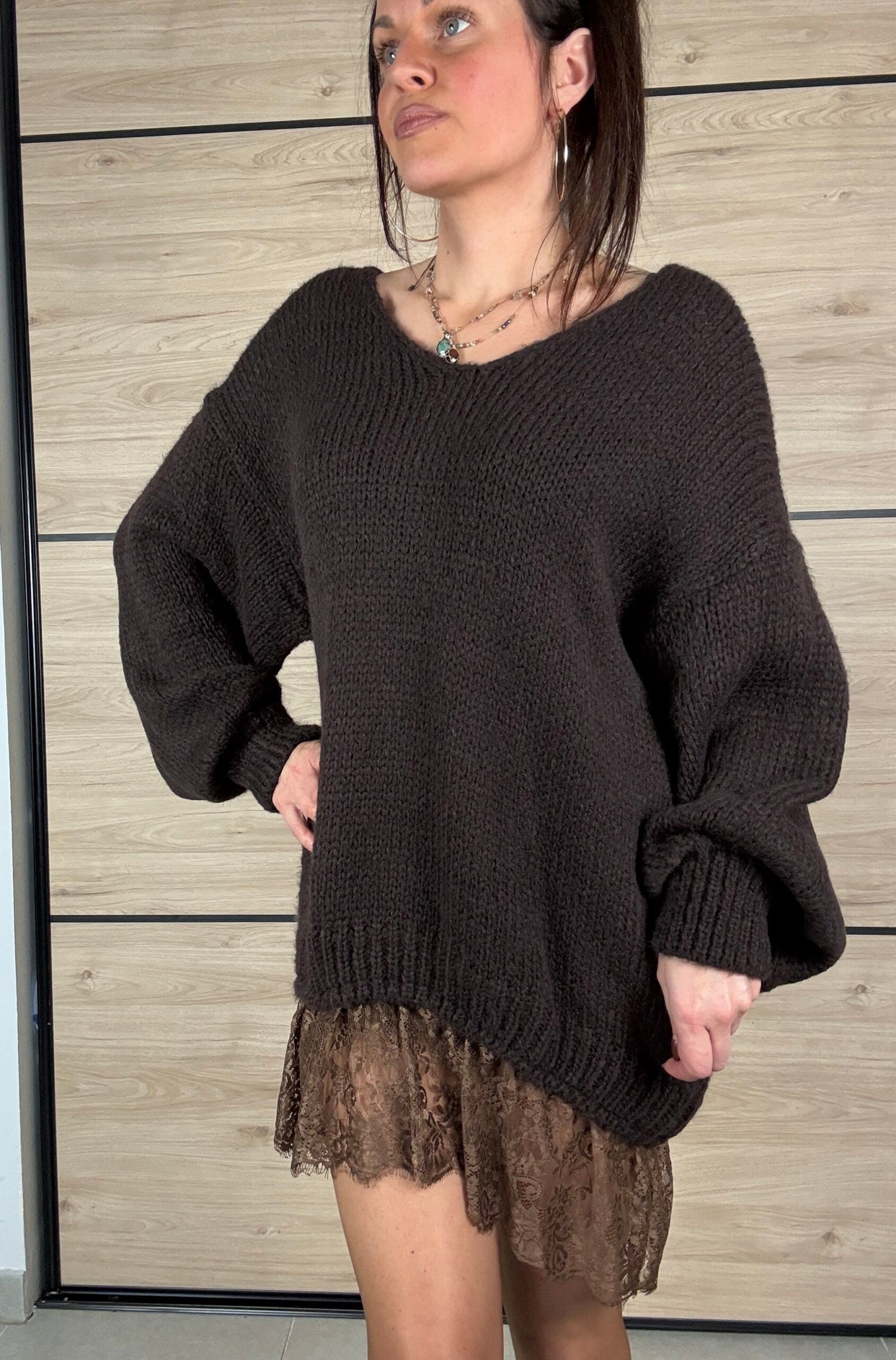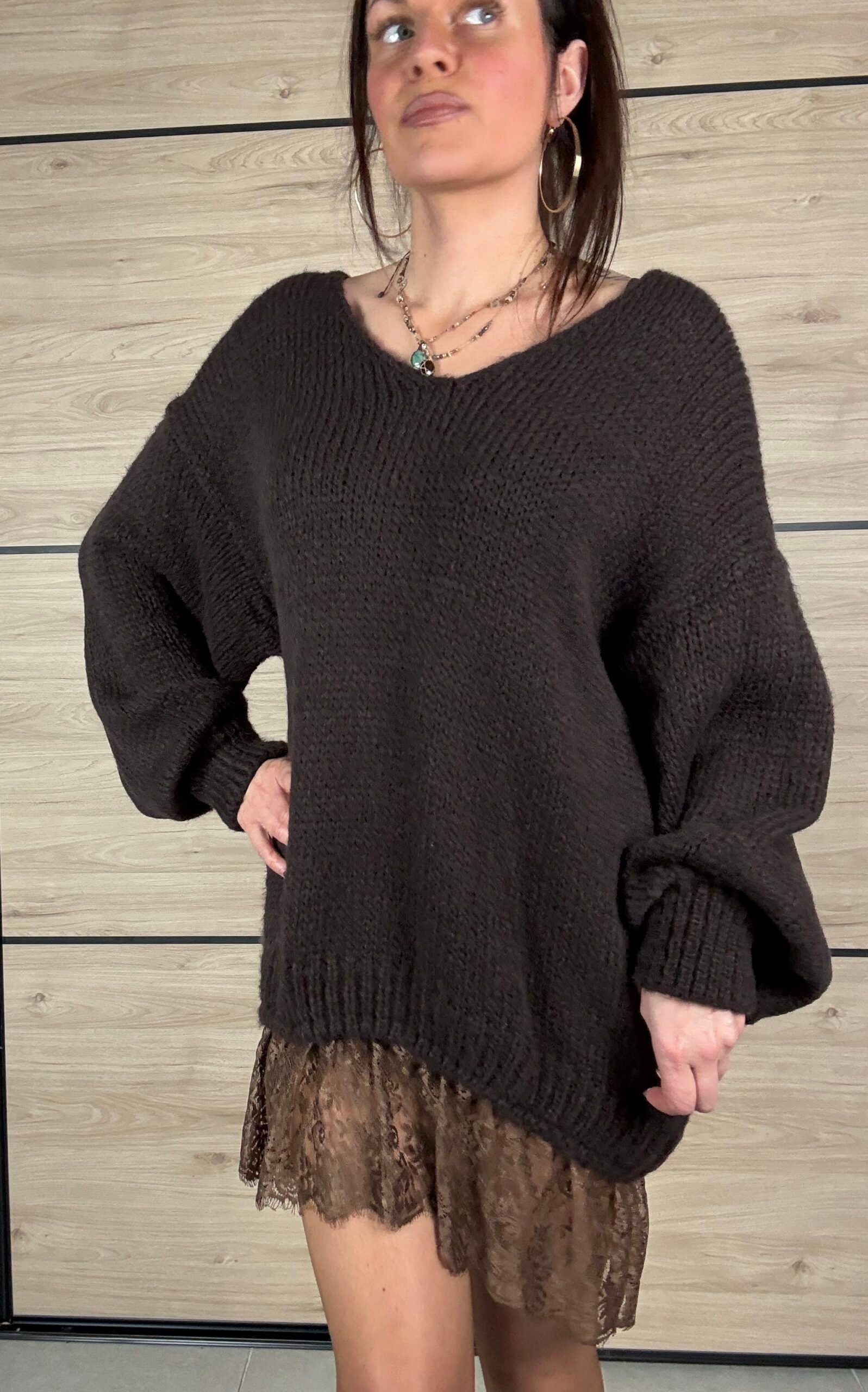 Sa dentelle délicate en bas apporte une touche raffinée, tandis que sa matière enrichie en mohair la rend chaude, douce et confortable. Sa coupe oversize garantit un style moderne et facile à porter.